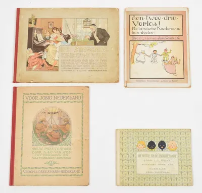 Prentjes van Jan Rinke. Amsterdam, Vennootschap Letteren en Kunst, c. 1925. 12 p. B/w and colour. Uncoloured plates coloured by child. Loose in binding + De Speelman van Hamelen....