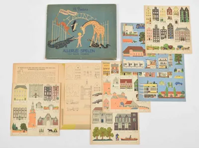 File with insert slots on the back for 7 model construction plates and a story/ manual on loose leaf. Circa 1943. Clean copy + El Pintor's Dierenparadijs. Allerlei Spelen met wilde...