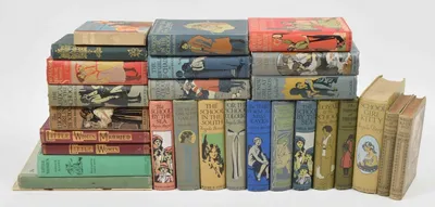 L.M. Alcott. London, Walter Scott, c. 1880-1900. 2 vols. Orig. cloth wrapper with gilt stamping + 3 other Little Women eds. + Susan Coolidge. What Katy Did. Boston, Roberts Brothers,...