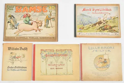 Copenhagen, Henrik Koppels Forlag, c. 1920, 1st ed. Leporello in 8 full-page colour ills. Oblong halfcloth, folio + Norsk Dyrebilledbok av Gumind Stenersen. Kristiania, N.W. Damm...