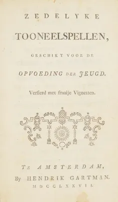 In zes vertellingen. Met plaatjes. Dordrecht, J. Zender, c. 1830. 127 p. Title plate and 5 plates in the text. Lacks wrapper, bound with cloth binding strip. 34 x 57 mm.