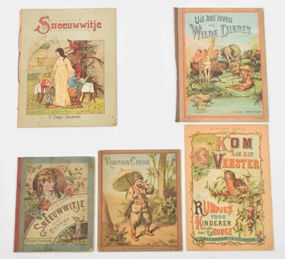 voor mijne vriendjes en vriendinnetjes door Oom Jakob. Met gekleurde plaatjes. 2nd ed. Amsterdam, P.M. van der Made. 60 p. with 5 coloured plates. 8vo, in orig. printed paper boards....