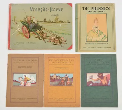 The Hague, G.W. Belinfante, 1913. 34 pp. Edgeworn + De Prinses op de erwt. Teekeningen van Hedvig Collin. Rotterdam, Nijgh & van Ditmar's Uitg. mij, 1930. Small name on first endpaper,...