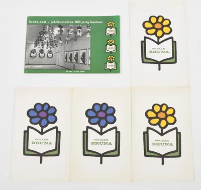 5 different publications related to the 100th anniversary of Bruna, 1968. Each with illustrations by Dick Bruna. 4 with lith. flower on the front in 2 colour variants. (1) a menu;...