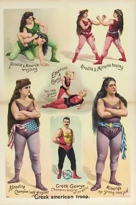 Afrodite & Minerva boxing. Emanuel & Charles, two little giants. Afrodite, champion lady wrestler. Greek George, champion wrestler of the world. Minerva, the strong iron jaw. Friedländer,...