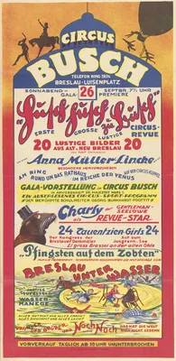 Erste grosse lustige Circus-Revue (...) Anna Müller Lincke (...) Charly der Gentleman-Seelöwe (...) Breslau unter Wasser. Friedländer, Hamburg, 1925. In 3 parts, 88 x 62 cm each....