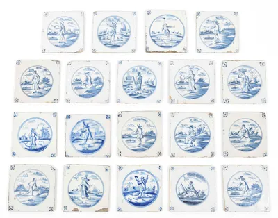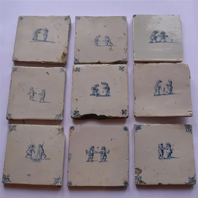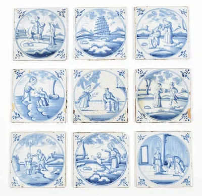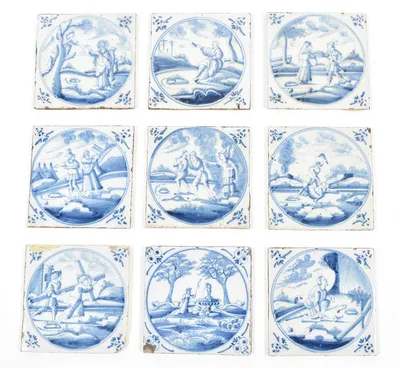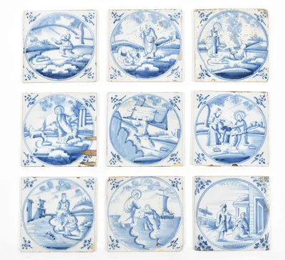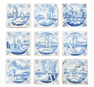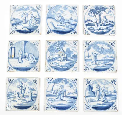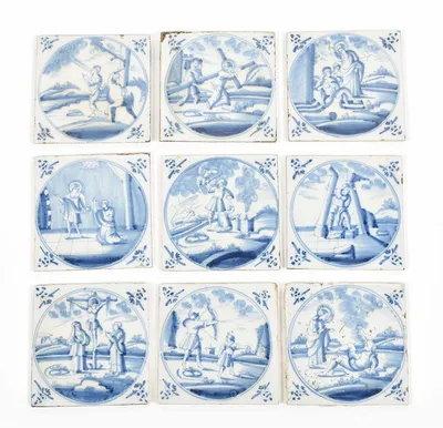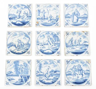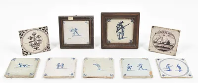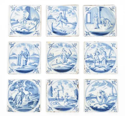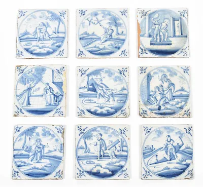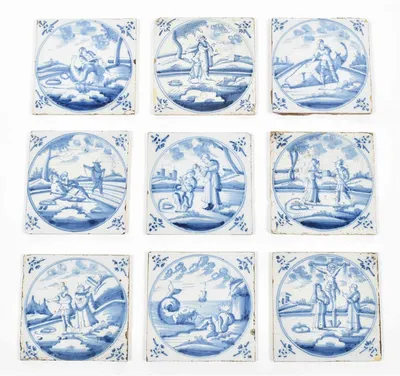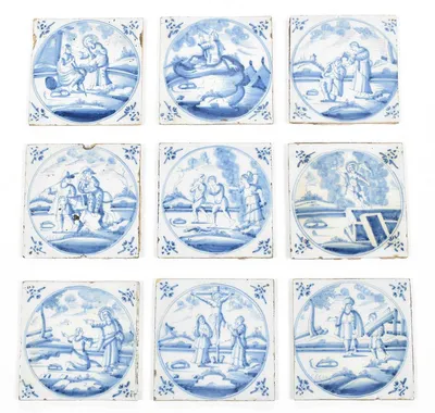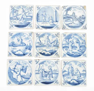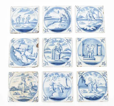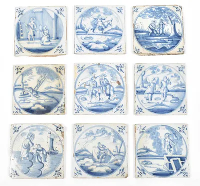 18th cent. All approx. 13 x 13 cm. Ceramic with blue and white tin glaze, a few with Manganese glaze. Depictions of a ship, biblical scenes, landscapes, animals, decorative floral...