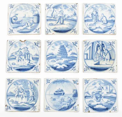 18th cent. 13 x 13 cm. Ceramic w. blue and white tin glaze. Depictions of a.o. Jacob and Esau, Adam and Eve being expelled from the Garden of Eden, Noah's ark, Joseph and Mary's...