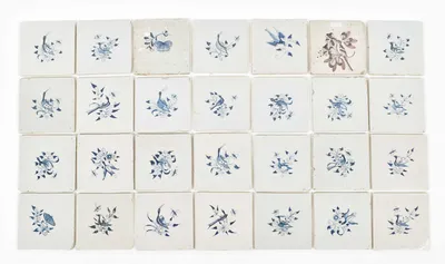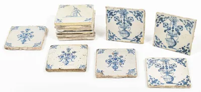 Early to mid 17th cent. All approx. 13 x 13 cm. Ceramic, blue and white tin glaze. 4 w. oxbow corner motif, 3 w. spider corner motif and 2 without corner motif. Added: 5 tiles...