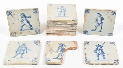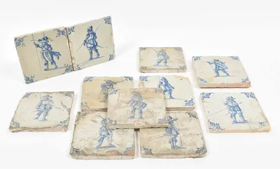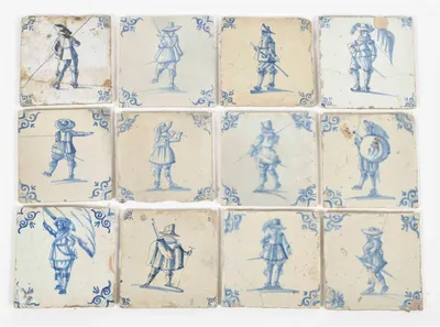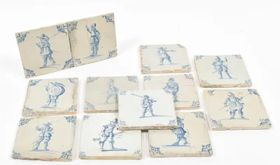 17th cent. All approx. 13 x 13 cm. Ceramic, blue and white tin glaze. All w. a single central figure of an armed soldier w. swords and lances (7), gunmen (3) and 1 drummer. Corner oxbow motif.