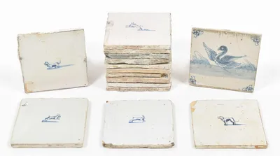 18th cent. (one 20th cent.). All approx. 13 x 13 cm. Ceramic, blue and white tin glaze. Spider corner motif. Some dam., 1 framed. Added: (1) 3 Dutch tiles w. animals. 18th cent....