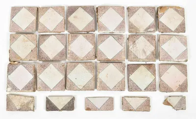 17th cent. All approx. 13 x 13 cm (1 sl. smaller). Ceramic, blue and white tin glaze. Repeating diamond motif. No corner motif, no frame.