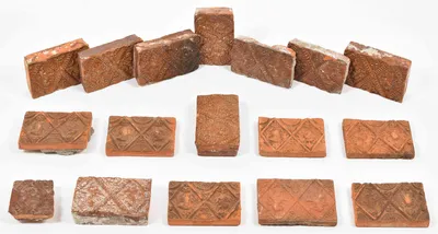 Late 16th cent./ early 17th cent. Dutch or Flemish. 10 heraldic tiles: 1 unglazed tile depicting 2 rampant lions in diamond frame w. flowers, dated 1598. 10 x 14.5 cm. 9 (and a...