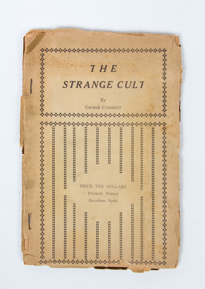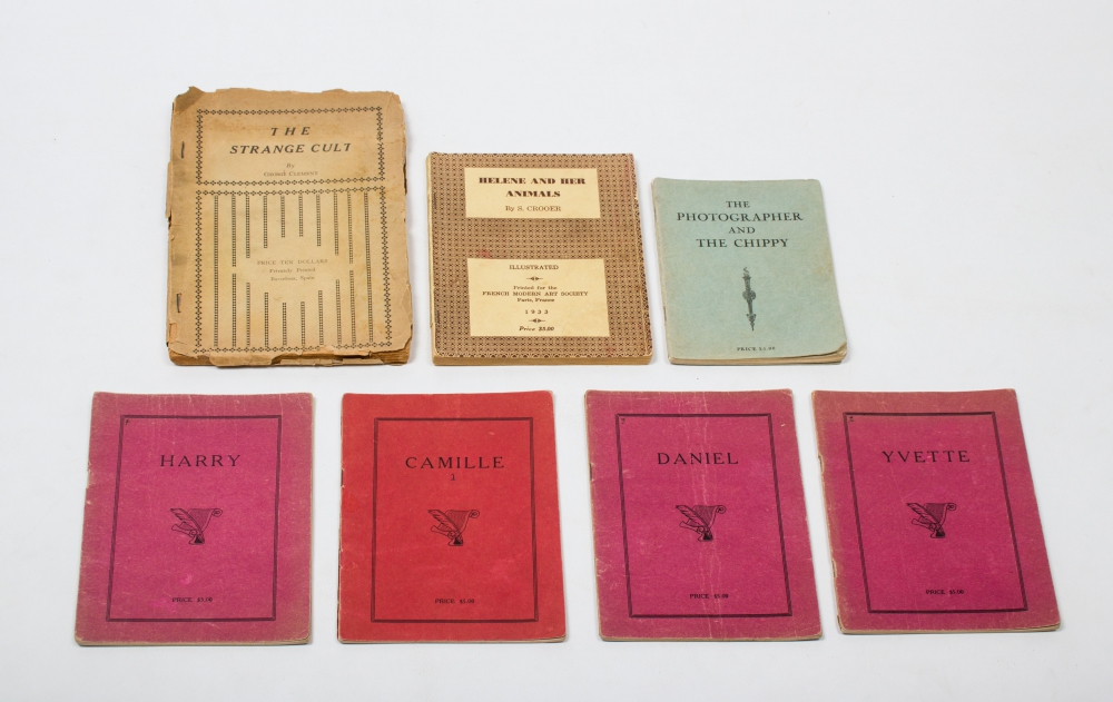 Author and publisher unknown, ca. 1935. Stapled, 36 pp. With 4 photo-illustrations - and 3 more from the same series + Helene and her animals by S. Crooer. Illustrated. Printed for the French Modern Art Society Paris, France, 1933. 58 pp. + The Photographer and the Chippy, author & publisher unknown, ca. 1935. 40 pp. - and The Strange Cult by George Clement. Price Ten Dollars. Profusely Illustrated. Reprinted from the Bound Book Edition, Privately Printed Barcelona, Spain, ca. 1935. 100 pp. Stapled. Slighly weathered edges, else good.