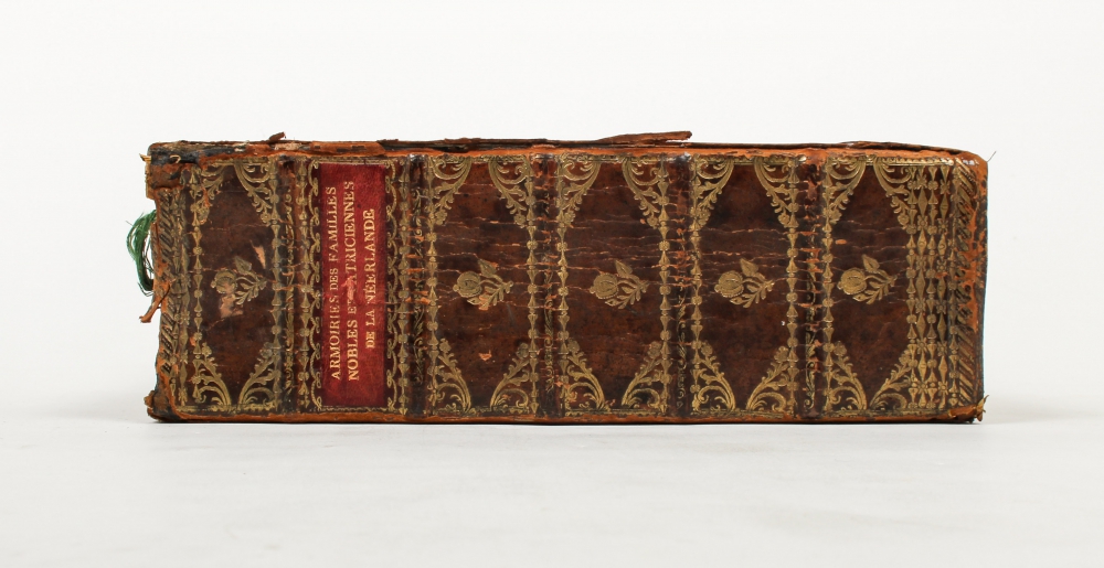 Par le Comte W. Alfred de Bijlandt." With: "Clèves, Julier, Berg, Provinces Rhénanes, Westphalie". Manuscript armorial, 19th century, with calligraphed title page followed by the main work in 11 parts of ca. 40 leaves each, with on recto of each leaf 16 coats of arms in gouache, followed by a second work with another ca. 80 leaves each with 20 coats of arms in gouache, both parts in alphabetical order complete from A to Z and the pages facing the pages with coats of arms name lists in pen, all parts together in earlier gilt school prize binding with the arms of Zwolle on both boards and morocco title shield on spine, 4to (minor defects to binding).