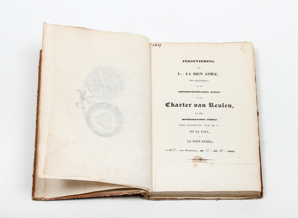 Feestviering der L. La Bien Aimée ter nagedachtenis van het driehonderjarig jubilé van het Charter van Keulen en het honderdjarig jubilé der stichting van de L. de la Paix, Amsterdam, 1835. Xviii, 218 (2) pp. On reverse "ten Bewijze van Echtheid, is dit exemplaar uitgereikt aan den Br. PP Roorda van Eysenga", with stamp of the Master. In orig. paper binding, spine damaged with small loss to paper.