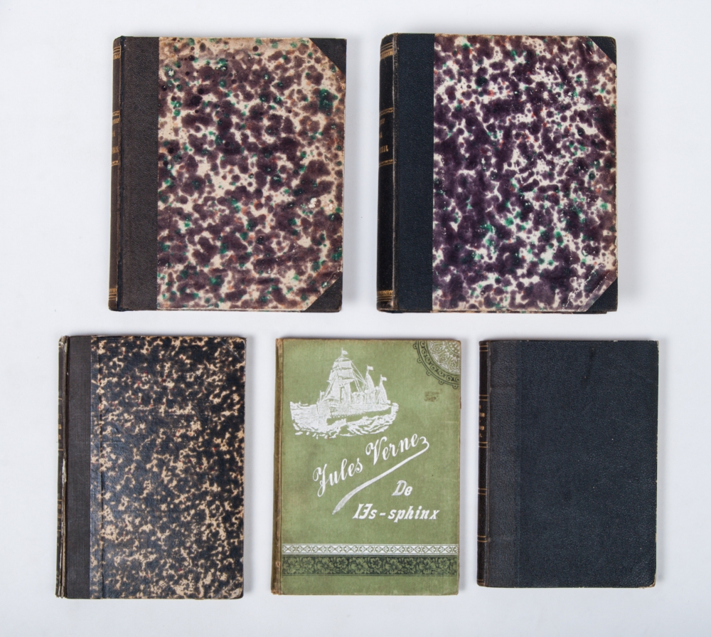 Jan Davids' Boekekraam, J.H. van Lennep. First and second volume. Haarlem, J.J. Weeveringh. xiv, (6), 206; (4), 48; xix,193 (5),48 pp. and third part xiv (2), 192, 32, (4), 48 pp. Uniformly bound in half cloth with marbled boards. Added: 3 early editions of Jules Verne concerning both polar regions: Een kapitein van vijftien jaar in slavernij, gevolgd door een overwintering in het ijs + Kapitein Hatteras de Engelschen aan de Noordpool. Both Rotterdam, Jac. G. Robbers, ca. 1900 + De IJs-sphinx, Uitg. maatsch. 'Vivat' Amsterdam, ca. 1900.
