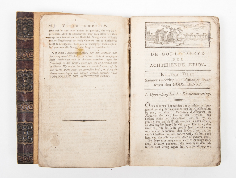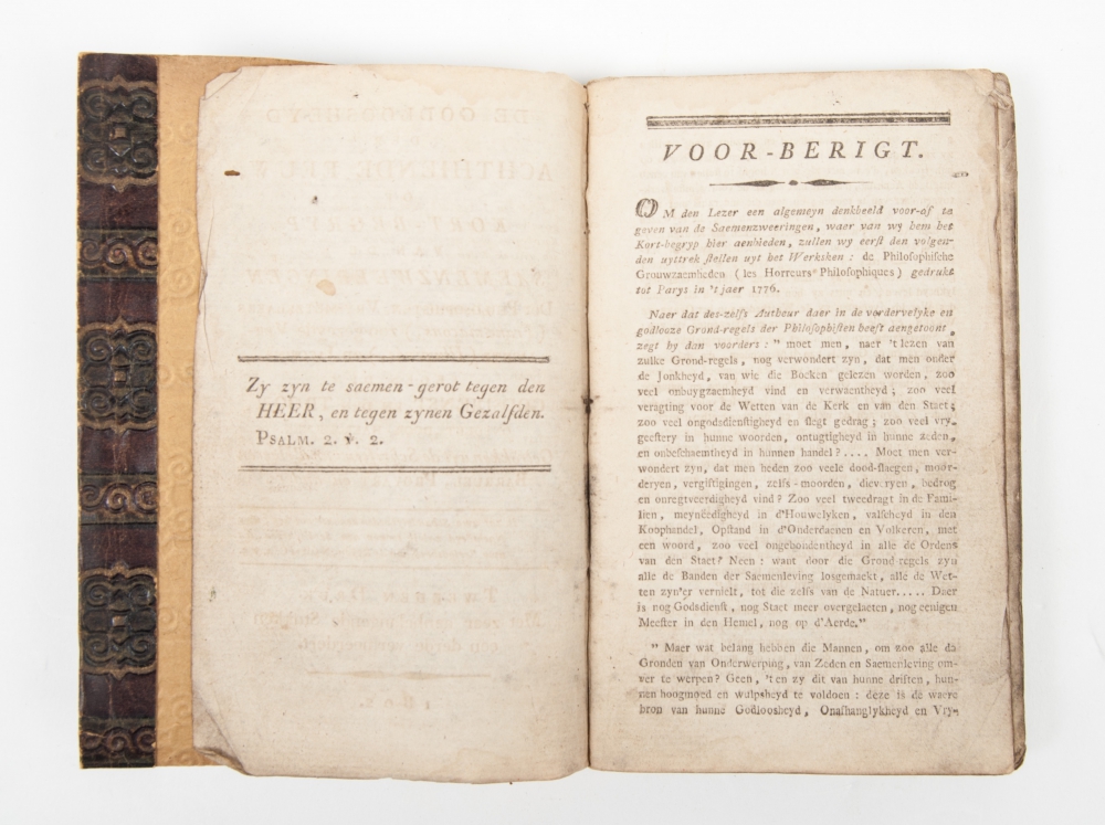 der Philosophisten, Vry-metzelaers, zoo-gezeyde Verlichte en Jacobins tegen den Godsdienst en den troon ontdekt door haer-zelven. Tweeden druk, 1802. viii, 280 pp. Bookblock laid in 19th-century paper binding.