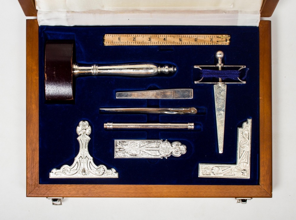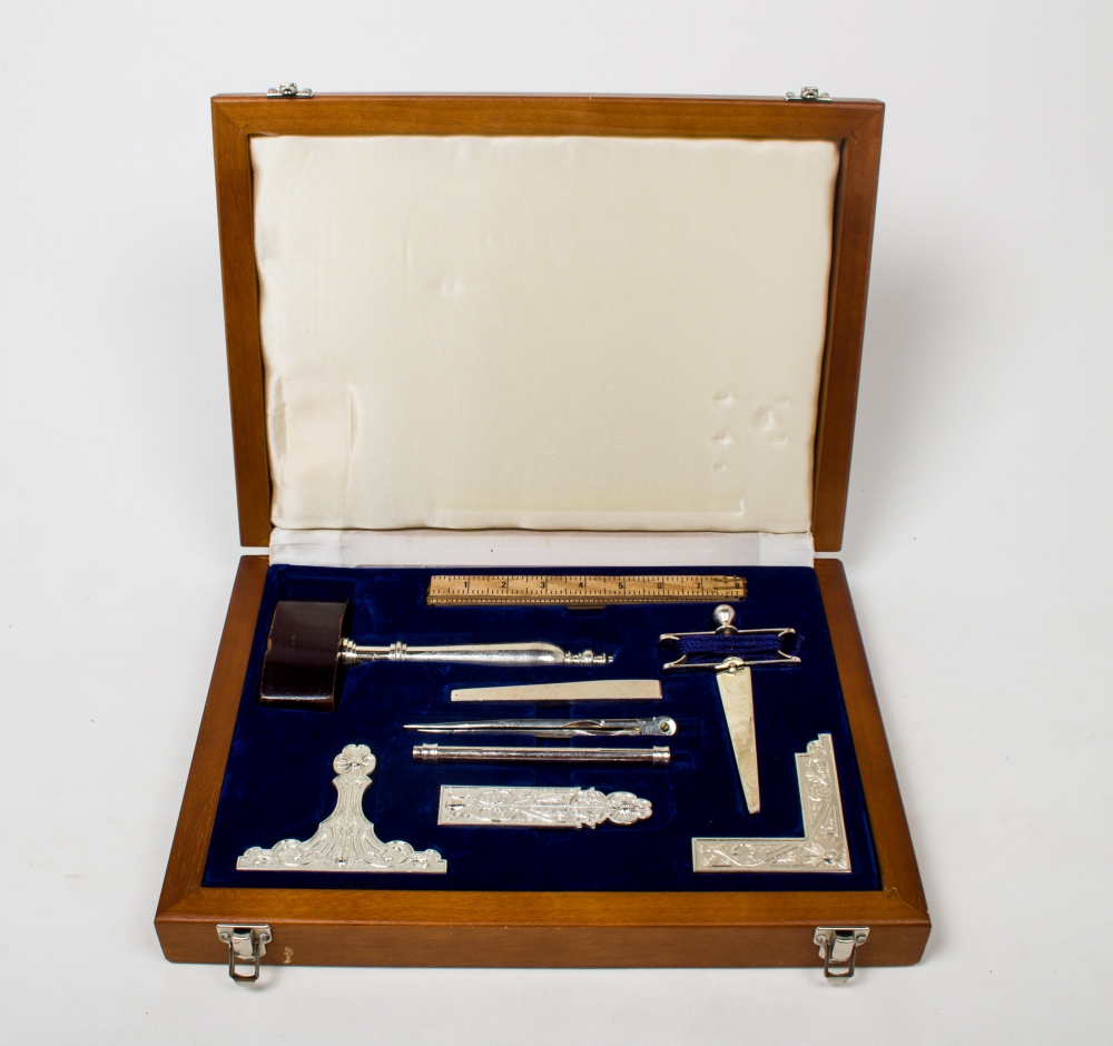 England, 20th century. Fine tool box with hammer, compasses, penholder, chisel, square, etc. 41 x 29 x 7 cm.