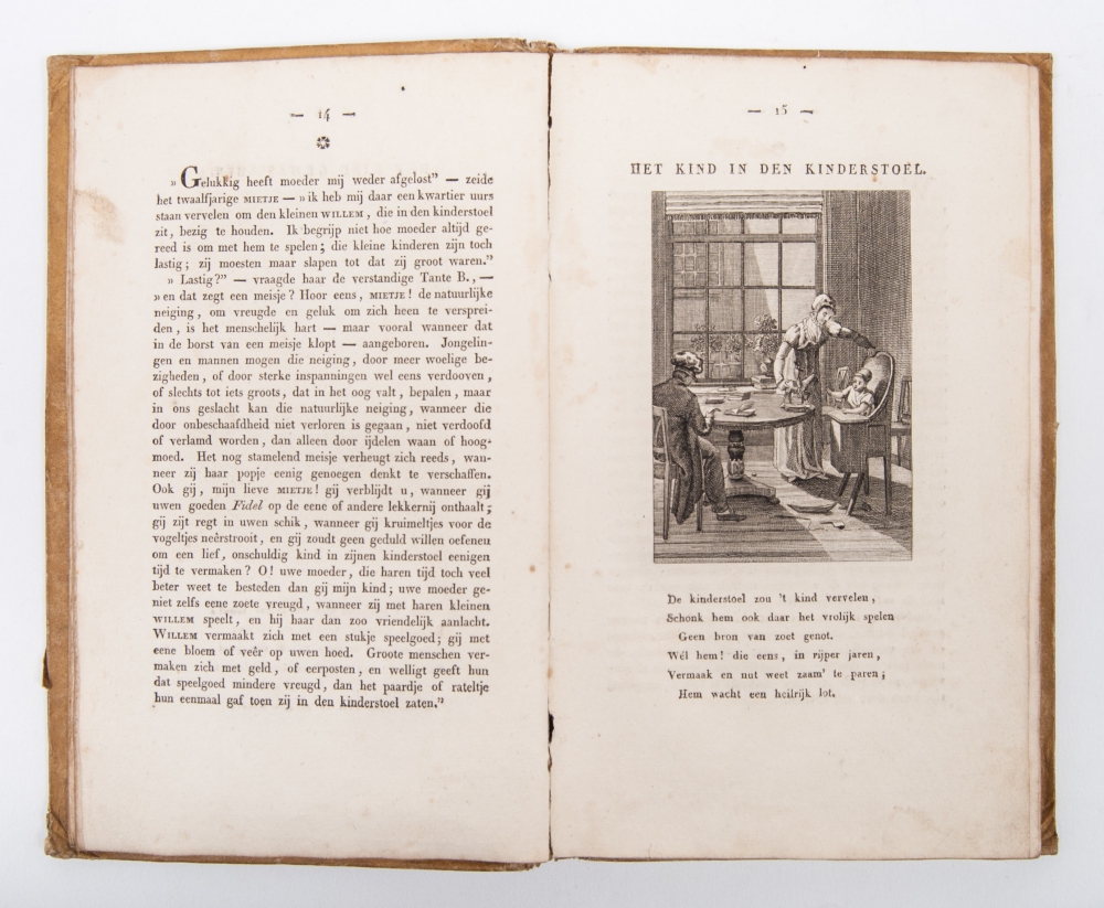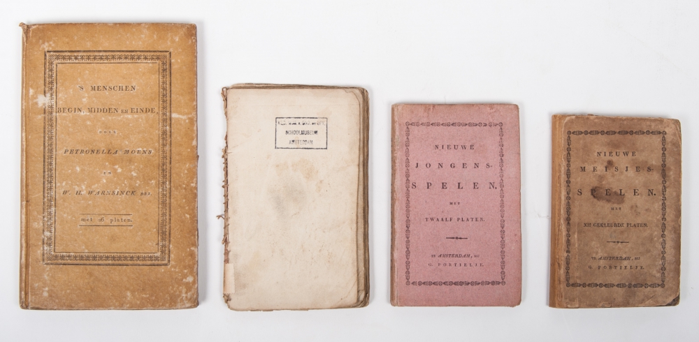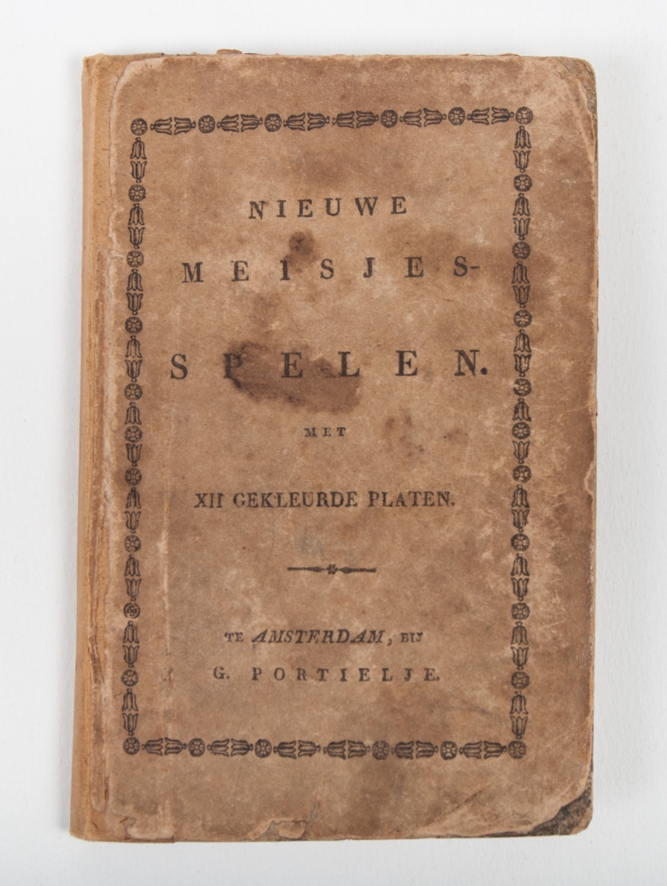 Amsterdam, G. Portielje, ca. 183. 48 pp. In orig. cardboard. 8vo. Good copy + Nieuwe Meisjes-spelen. Met xii gekleurde platen. Amsterdam, bij G. Portielje. 2e druk. 8vo. In repaired binding with renewed endpapers and binding using orig. boards. 48 pp. + 's Menschen begin, midden en einde door Petronella Moens en W.H. Warnsinck BSZ. met 26 platen. Amsterdam, Ten Brink & de Vries, 1824. 68 pp. In orig. cardboard - and 1 more.