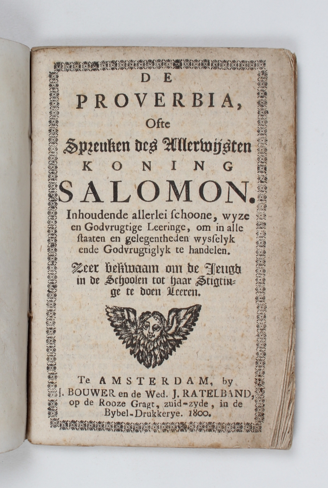 Inhoudende allerlei schoone, wyze en Godvrugtige Leeringe, om in alle staaten en gelegentheden wyselyk ende Godvrugtiglyk te handelen. Zeer bekwaam om de Jeugd in de Schoolen tot haar Stichtinge te doen leeren. Amsterdam, J. Bouwer en de weduwe J. Ratelband, 1800, 88 p., contemporary vellum cover, small 8vo.