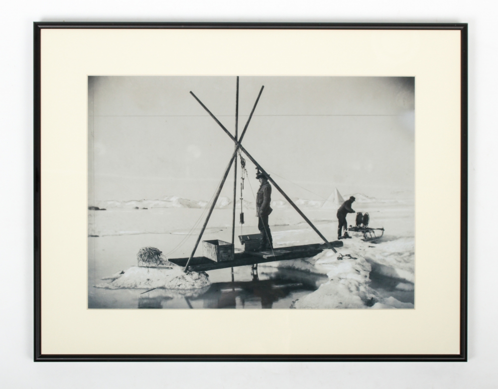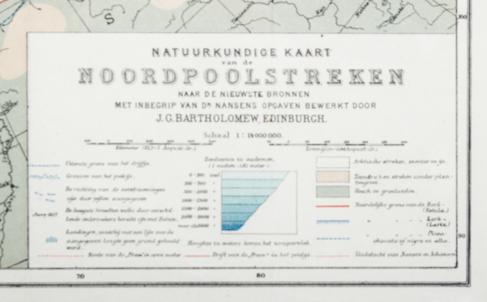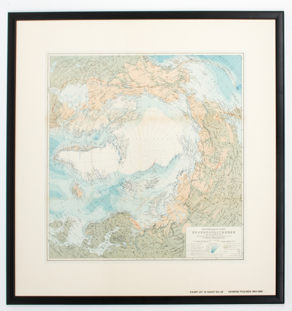 Natuurkundige kaart van de Noordpoolstreken naar de nieuwste bronnen. Met inbegrip van dr Nansen's opgaven bewerkt door J.G. Bartholomew, Edinburgh. Map from "In nacht en ijs", Nansens Poolreis 1893-1896. 53 x 55 cm. Mounted in frame under glass. Outer size 76 x 72.5 cm. + a later printing on large size in gelatin silverprint of Nansen during the voyage. 29 x 40 cm. Framed under glass.