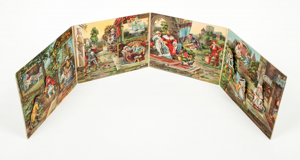 Barnard Way, London / Paris / New York, Raphael Tuck & sons Ltd, ca. 1912. 4 leaves in leporello together forming an inserted panorama, with 16 figures.