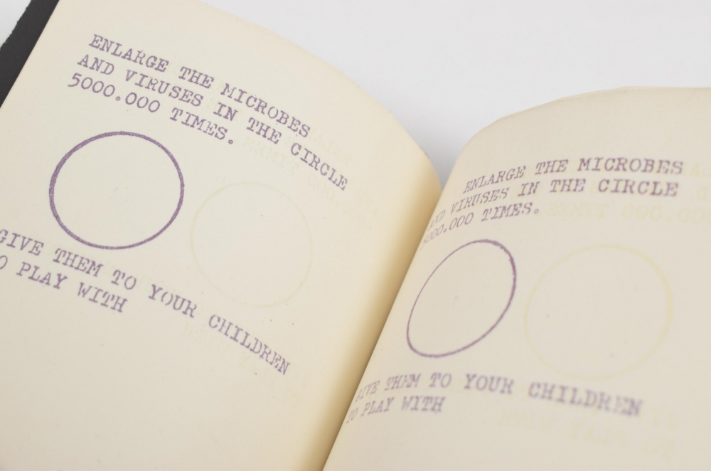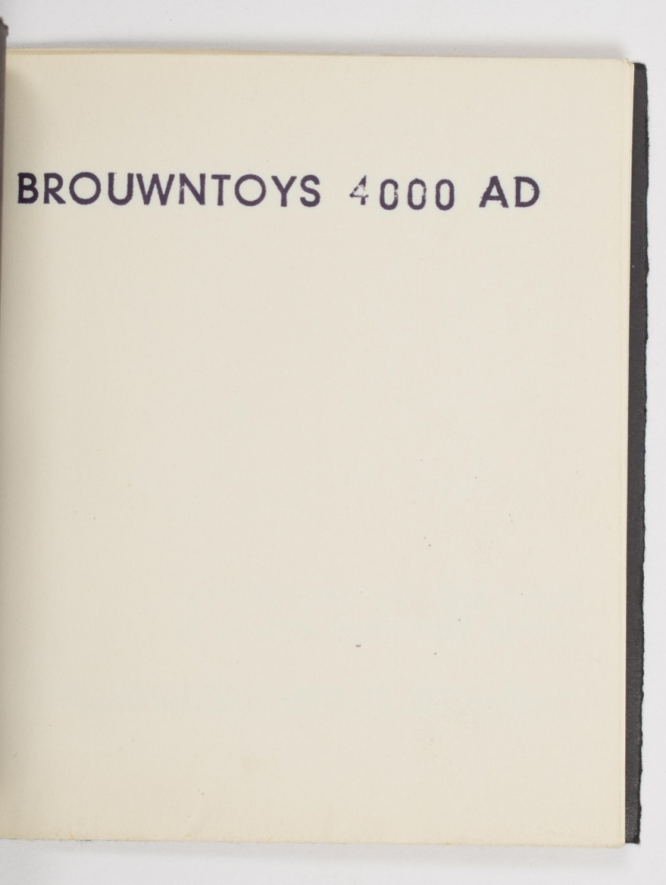 Self-published, 1964. Softcover, 11 x 11 cm. Edition size unknown but probably very small. Two sheets of white paper folded in six, creating 24 pp. Twenty pp. are mimeographed in blue ink with the same two texts: 'Enlarge the microbes and viruses in the circle 5000.000 times. Give them to your children to play with' and 'Don't use the Brouwntoys before the year 4000 A.D.'.