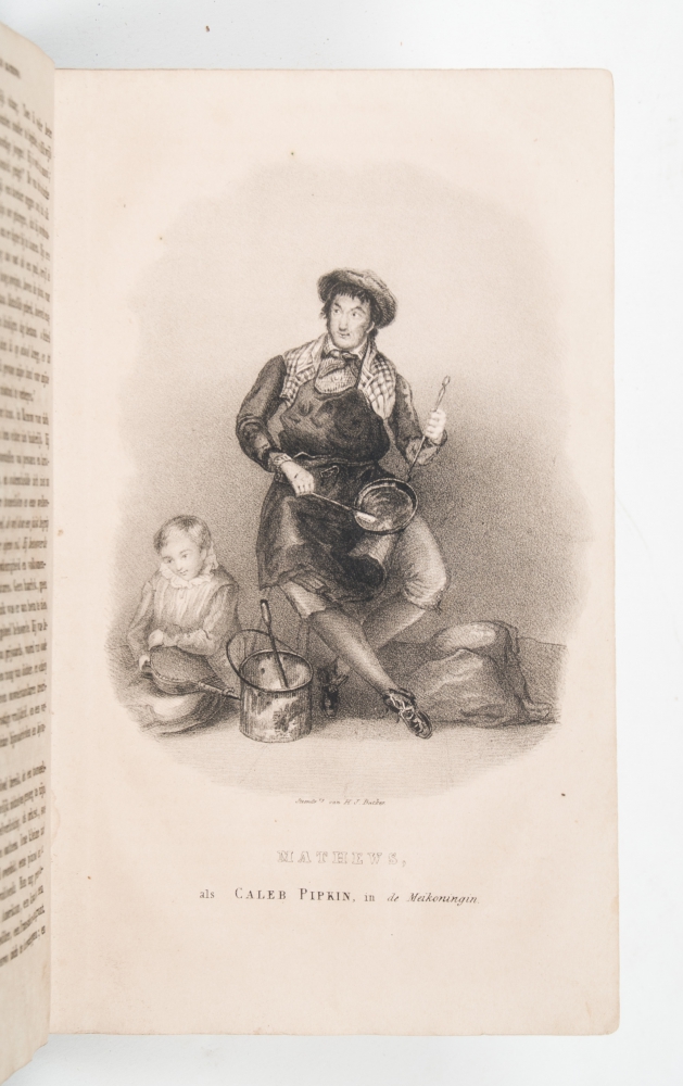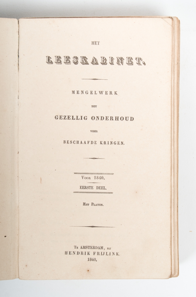 Mengelwerk tot gezellig onderhoud voor beschaafde kringen. Met platen. Amsterdam, Hendrik Frijlink, 1838-1855. 15 parts in 10 volumes. 8vo, in half cloth with marbled boards (19th-century library), title on vignette on spine.