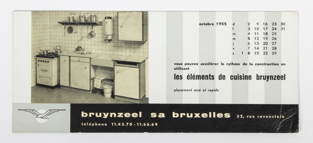 "Bétonplex Bruynzeel en 18 et 4 mm d'épaisseur". Février 1955 + "Parquet Bruynzeel". Avril 1955 + "Bruynzeel sa Bruxelles". Septembre 1955 + "Les éléments de cuisine Bruynzeel". Octobre 1955. Small bend bottom left.