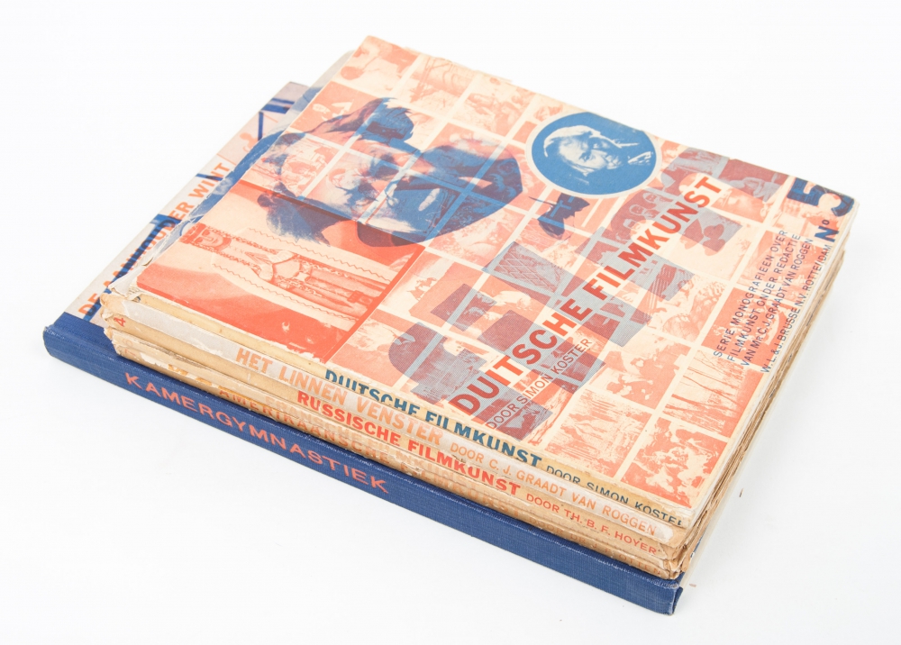 Het linnen venster door C.J. Graadt van Rogen, no. 1 + Russische filmkunst no. 4 + Duitsche filmkunst no. 5 + Fransche Filmkunst no. 6 + Amerikaansche filmkunst no. 7. All W.L. & J. Brusse, 1931. In fair condition, with usual damage to edges and wear to spines, volume 7 loose along spine - and Kamergymnastiek voor iedereen. W.P. Hubert van Blijenburgh. W.L. & J. Brusse, Rotterdam, 1930. Hc in half cloth, on back side the accompanying supplements. Each binding design Piet Zwart.