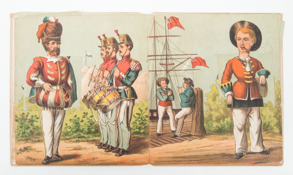 Haarlem, I. de Haan. 12 pp. with 8 "magic pages" in the middle, consisting of figures with 2 notches, into which could be inserted 4 lithographed figures of the same size, changing the central piece.