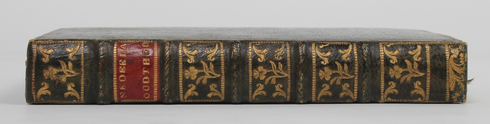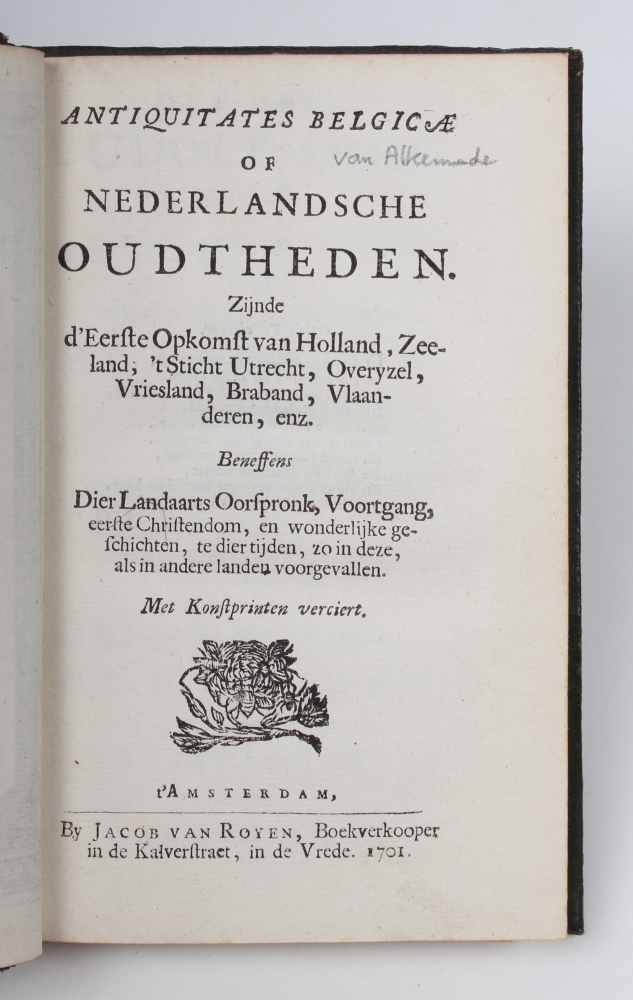 Zijnde d'Eerste Opkomst van Holland, Zeeland, 'tSticht Utrecht, Overyzel, Vriesland, Braband, Vlaanderen, enz. [Van Alkemade]. Amsterdam. Jacob van Royen. 1701. Small 8vo, green morocco, title on spine with gilt stamping, gilt edges, marbled endpapers, (10),224 pp. + "bladwijzer". Complete with folding map and numerous engravings, most outside the text.