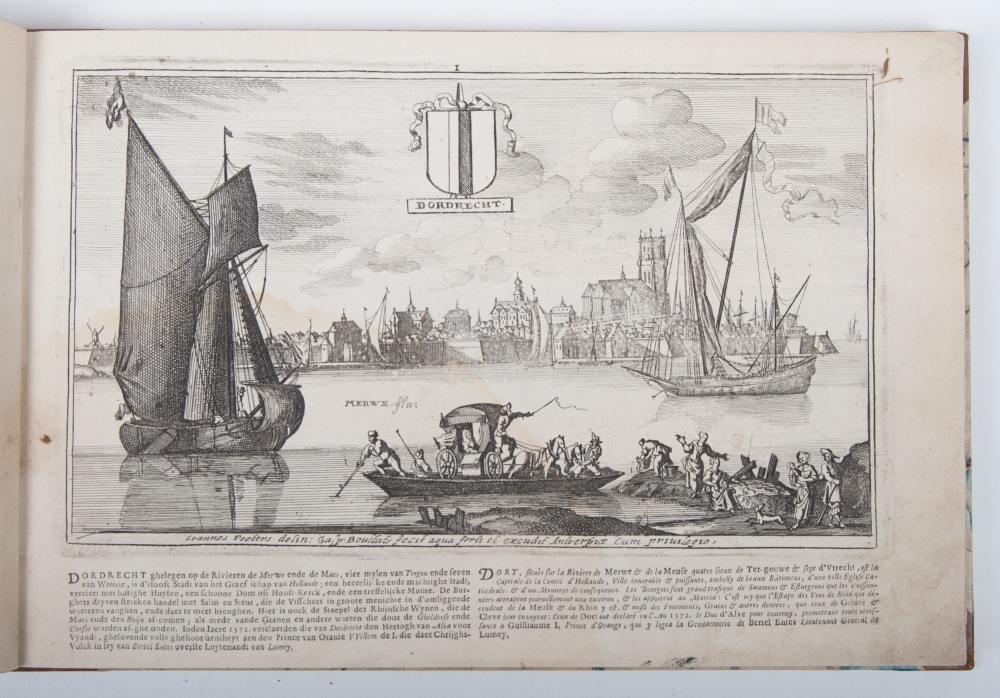 Oblong, rebound, half leather with marbled boards, title on spine in gilt stamping, title page with emblematic illustration and title in Dutch and French. 2 pp. prints numbered in ms., 8 intertitles with the prints, 86 leaves with views of cities. Lacks 4 leaves. Various engravings (water)stained and with tears, these repaired. Manuscript bladwijzer at the end. Front endpaper with dedication to Michel le Blon by Jean Meyssens in copperplate.