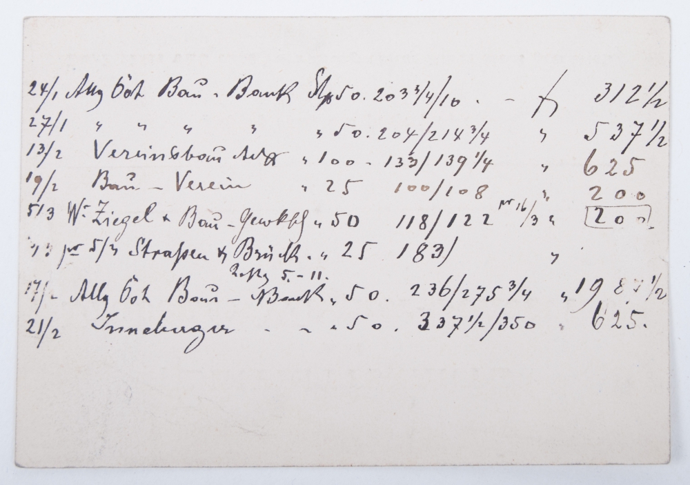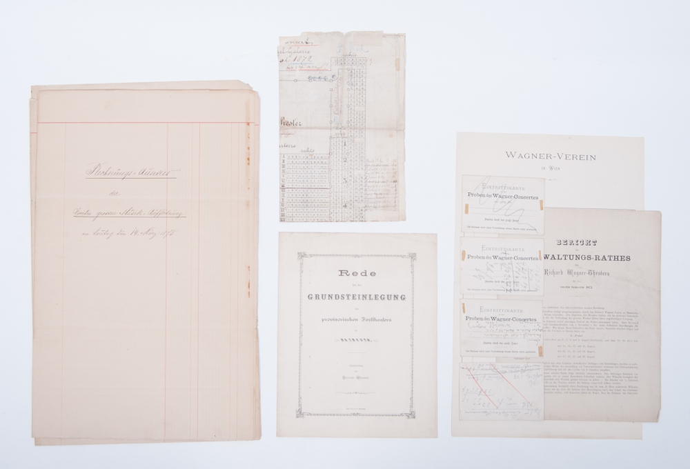 Lot contains: 1) speech by R. Wagner for the laying of the cornerstone of the provisional theatre in Bayreuth, ca. 1874 + 2) Plan for large and small hall, 1872 + 3) Message 'Verwaltungs-Raters' of the Richard Wagner theatre, 1875 + 4) Various manuscripten including 'Rechnungs-Ausweis' (bookkeeping), 1875 + 5) Various admission tickets.