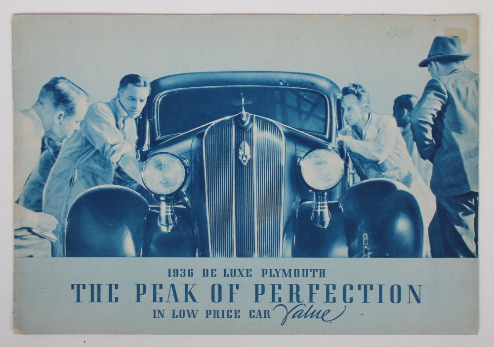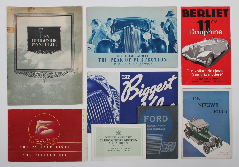 Ford V8. Wenken voor den eigenaar, 1937. 64 pp. Stapled + Berliet 11cv Dauphine. "La voiture de classe à un prix modéré". 4 pp. + De nieuwe Ford. 13 pp. Stapled. Ca. 1930 + Nederlandsche carrosseriefabrieken Voorschoten, ca. 1930. 4 pp. + The Packard Eight for 1938. 16 pp. + De luxe Plymouth 1936. 20 pp. + The Biggest Value in Plymouth History. Ca. 1936. 22 pp. Stapled + Een beroemde familie. General Motors. Een auto voor iedere beurs en voor elk doel. Antwerp, ca. 1930. 16 pp.