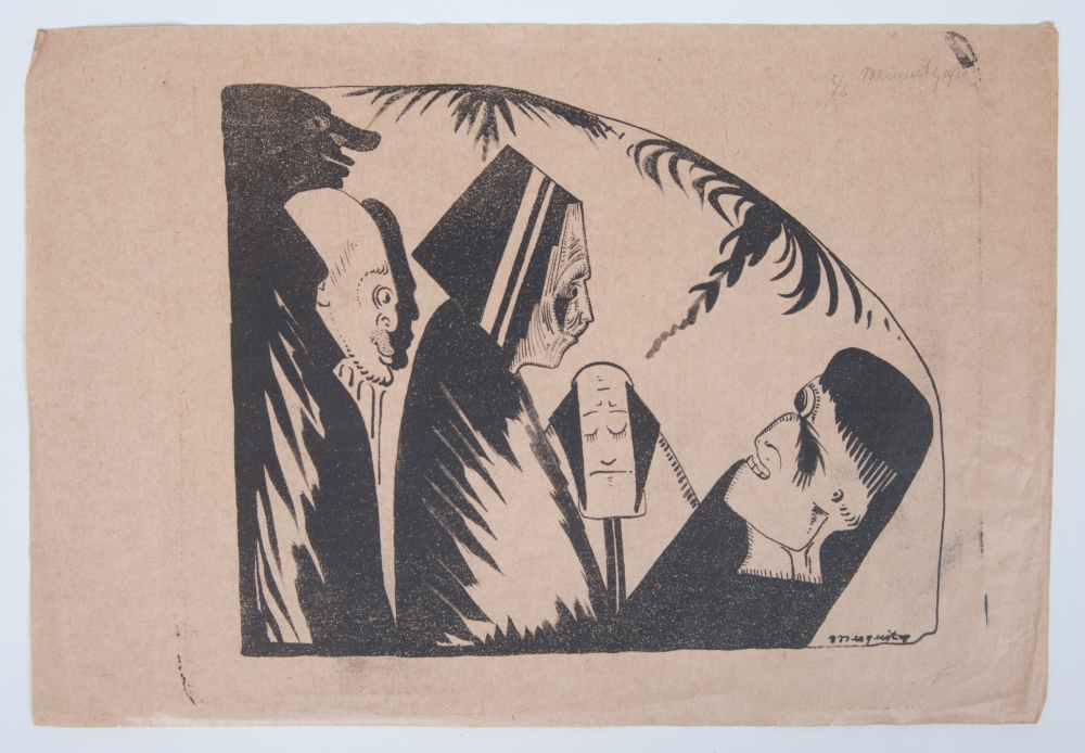 5 figures. Woodcut, printed signature. 24 x 31.5 cm.