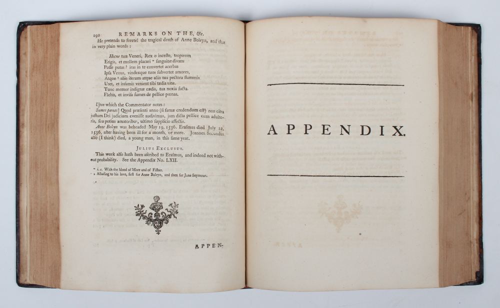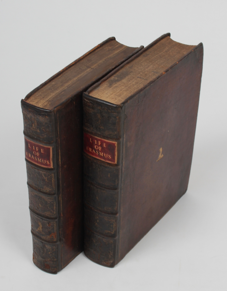 Le Clerc. London. J. Whiston and B. White. 1758-1760. 4to, leather, 2 volumes, uniformly bound, title on spine in red and gilt stamping. Boards with unknown family arms in gilt stamping. Portrait of Erasmus in mezzotint by Houston after Holbein, 2x title in red and black, VI,630; 753,(1) pp. The first volume with 2 plates in facsimile with extracts from the manuscript of Erasmus and others and 4 facsimile plates in the second volume. Idem. 2x 2 ex libris on endpapers. The portrait and the first volume at the front waterstained, title pages slightly tanned, else good.
