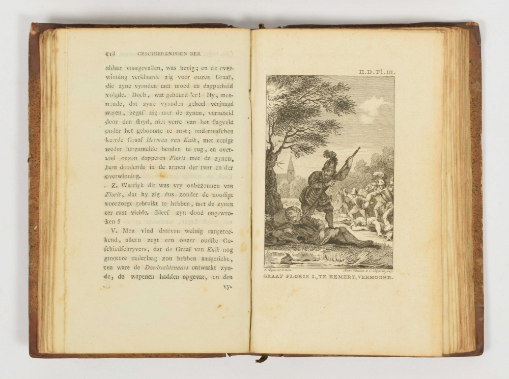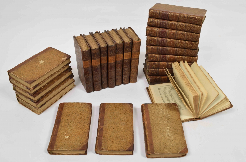 Met plaaten en portraiten [By Jacobus Kok en Jan Fokke]. Amsterdam, J. Allart, 1783-1795, 25 volumes, ± 250 p. per volume, in volume 25 the general index, with handcoloured, engraved map in volume I, 1 extra folding engraved plate of a naval battle by Bendorp (vol. XIV), 155 engraved plates and 121 engraved portraits (incl. 2 extra), contemporary uniform halfleather, gilt backs with raised bands with morocco title shields, 12mo.