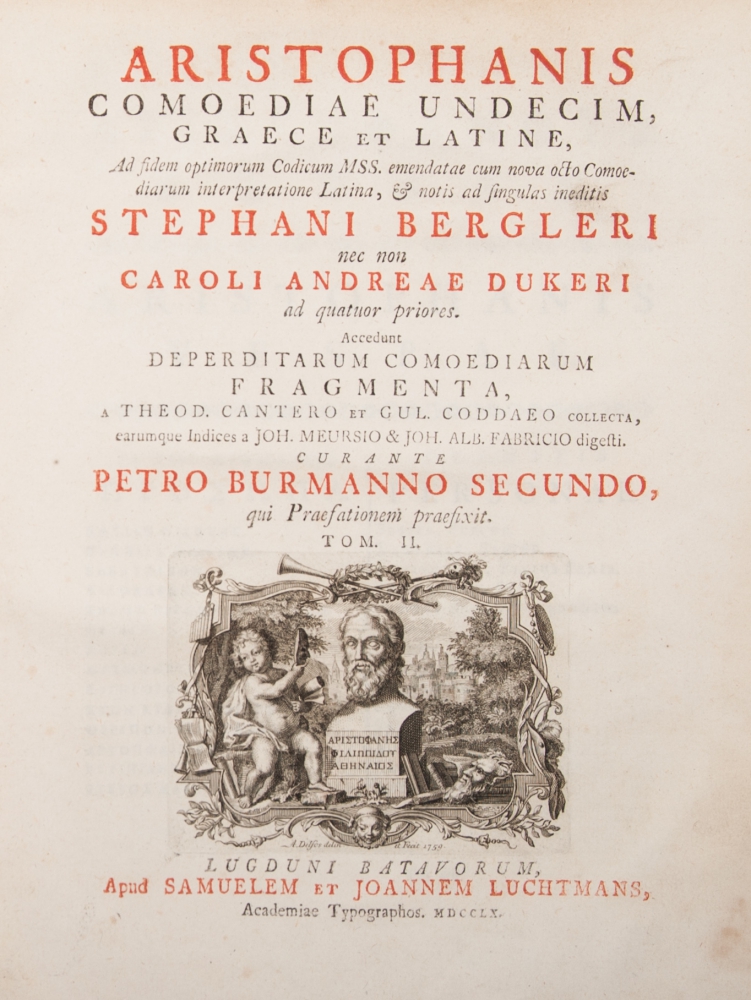 Combined with: Aristophanis Comoediae Undicim, Graece et Latine. Ad fidem optimorum Cod. Mss. emendatae cum nova octo Comoediarum interpretatione Latina & notis ad singulas ineditis Stephani Bergleri nec non Caroli Andreae Dukeri ad quatuor priores (...) curante Petro Burmanno Secundo. Leiden. S. en J. Luchtmans. 1760.