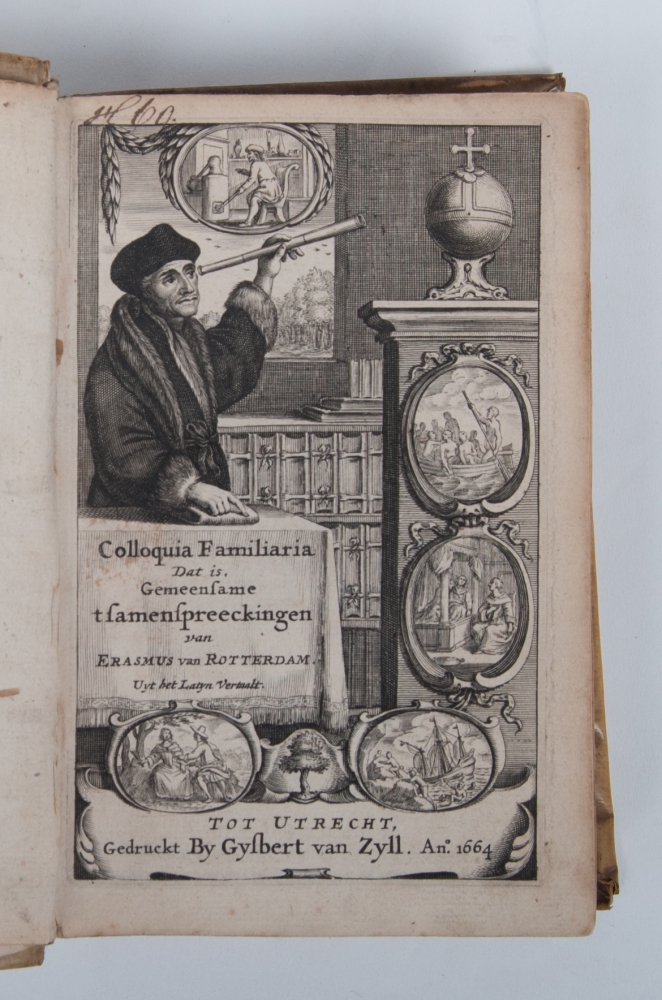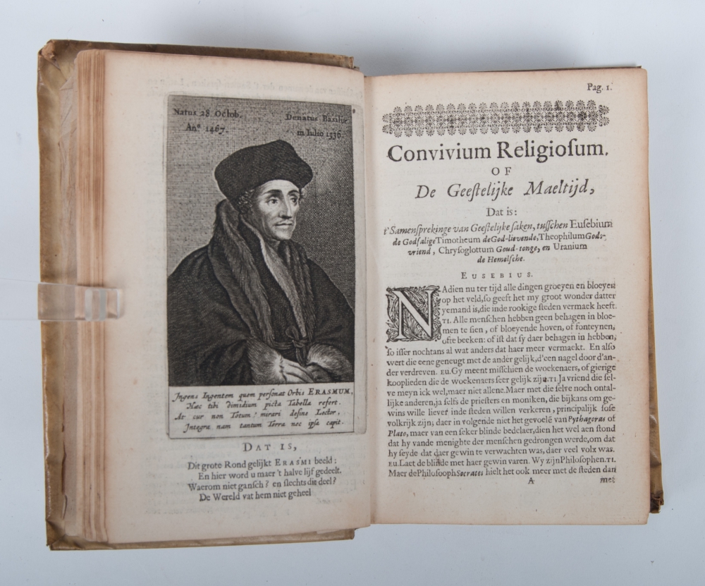 Waer by op nieus gevoegt is Dulce Bellum inexpertis, Dat is Den Krijg is den onversochten soet: Als ook Sileni Alcibiadid, Of Schyn bedriegt (...). Utrecht, G. van Zyll, 1664, (24),759,(1) p., with engraved frontispiece and portrait, contemporary vellum with manuscript title on spine, small 8vo (very good copy with minimal defects).