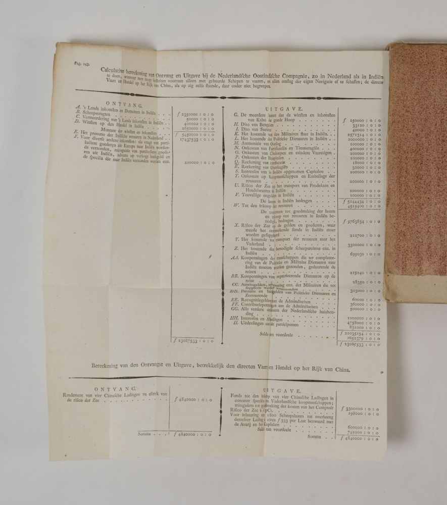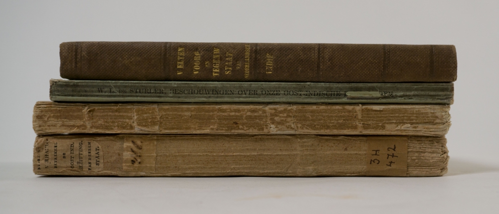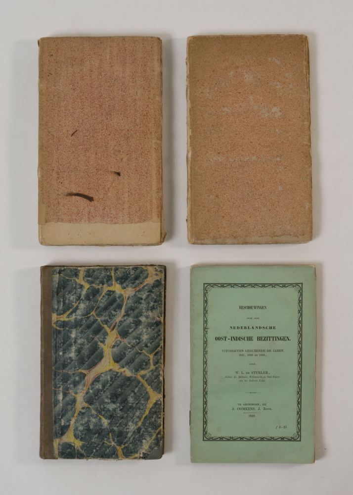 Approved by the publisher in pen, at the end of the preface. Schutte, De Nederlandse Patriotten en de koloniën, p. 182; (2) Adres van participanten der Nederlandsche Oost-Indische Maatschappij aan het staats-bewind der Bataafsche republiek; houdende Een geschiedkundig en beredeneerd vertoog van de rechten dier Maatschappij, van haare gewigtige betrekkingen tot den Staat, en de overéénstemming van haar voortduurend bestaan met de algemeene belangen [door H.C. Cras]. Amsterdam, P. den Hengst, 1802, (2),166;26,(6) p., with (folding) tables, contemporary limp cardboard. Good, untrimmed copy, here and there with old annotations in pencil/ pen. With contemporary owner's name "Van Hogendorp" in pen on the free endpaper, possibly politician Gijsbert Karel van Hogendorp (1762-1834) (see lot 1436); (3) Iets over den voorgaanden en tegenwoordigen staat van Nederlandsch Indië, vergezeld van twee vlugschriften (...) door N. van Elten. The Hague, Gebr. Van Cleef, 1835, (4),III,(1),245 p., contemporary half cloth (half title stuck to inside front board); (4) Beschouwingen over onze Nederlandsche Oost-Indische bezittingen. Uitgegeven gedurende de jaren 1847, 1848 en 1849. Door W.L. de Sturler. Groningen, J. Oomkens J. Zoon, 1849, 4 parts with individual title pages (1847-1849) in one volume, (4),39,(1); 46,(2); 53,(3); 74,(2) p., original wrapper (good copy) (total 4).