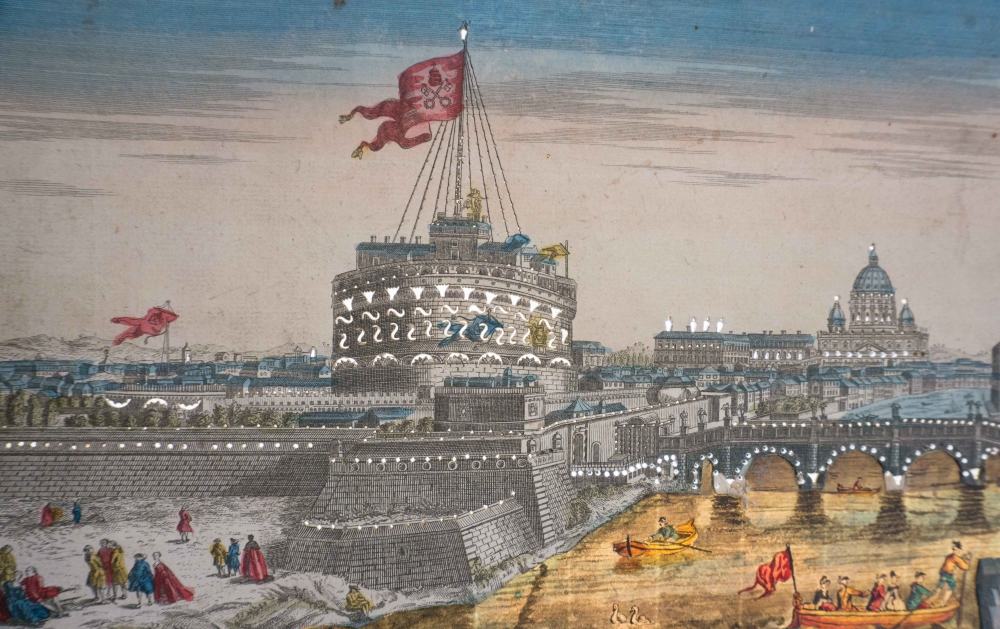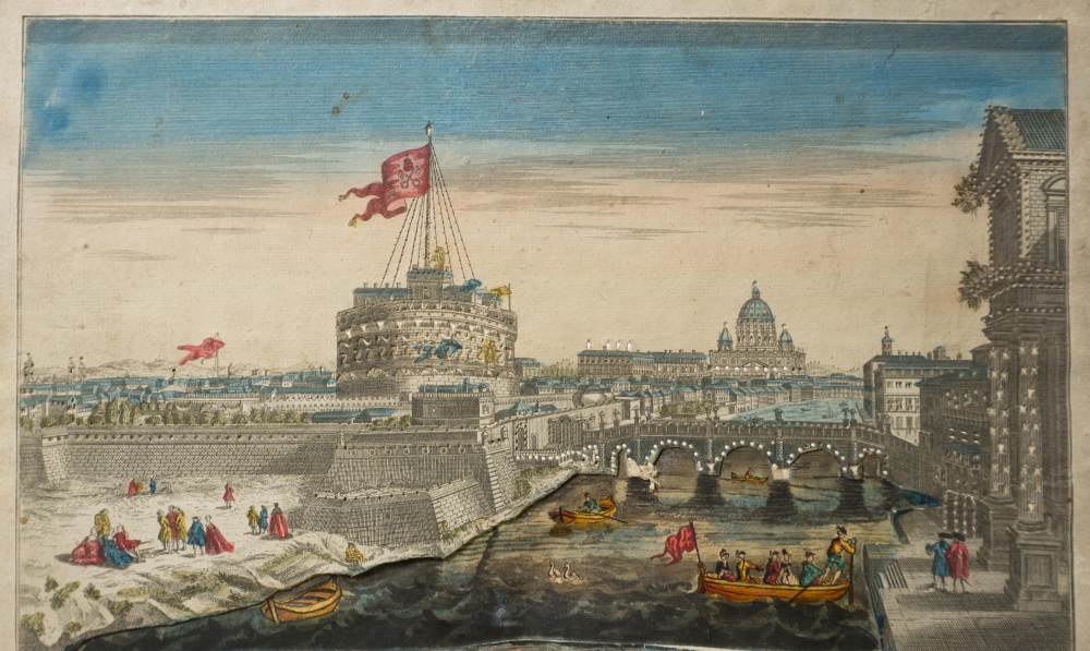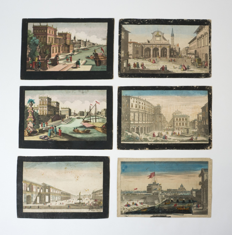 All with black border, all openworked with lighting effect. One print (untitled) cut out along bottom with river scene in watercolour. Here and there some staining and traces of use (total 6).