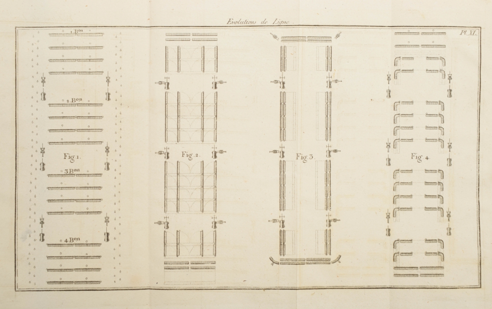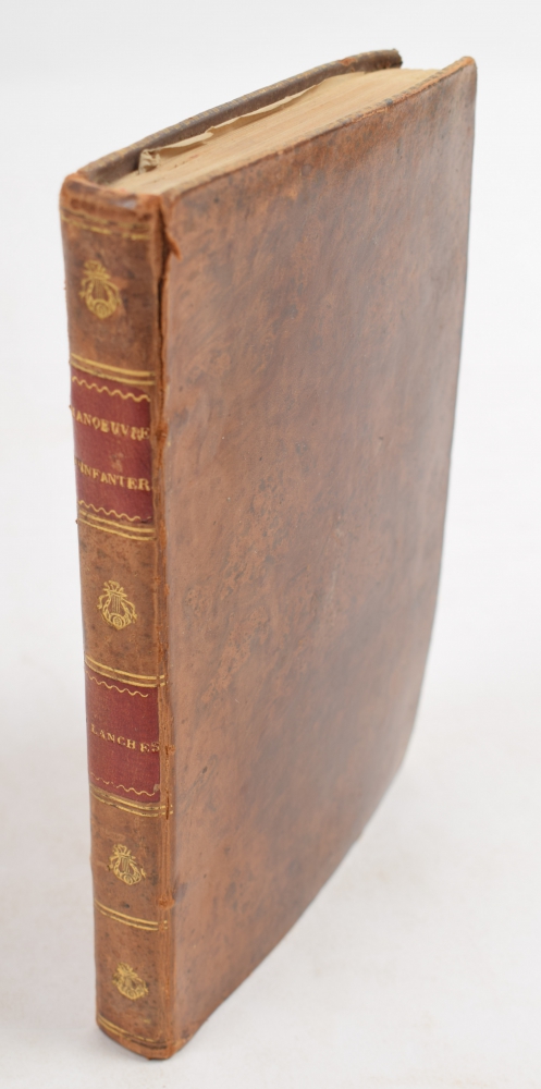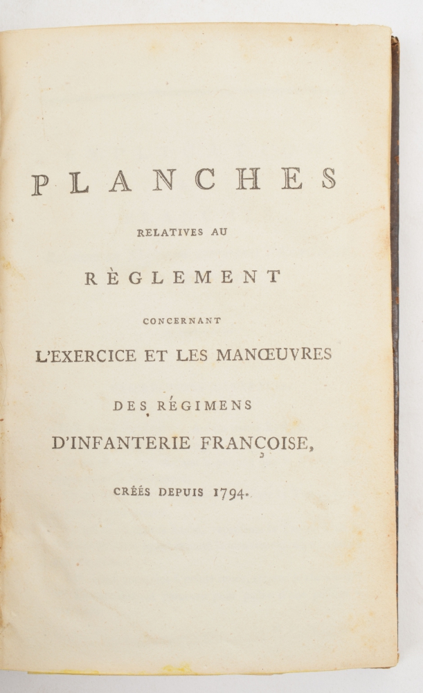 Planches relatives au Règlement concernant l'Exercice et les Manoeuvres des Régimens d'Infanterie Francoise, créés depuis 1794. Small 8vo, leather, title on spine in red and gilt stamping, 92 pp., complete with 40 images on 38 folding plates, all in copper engraving. Lovely copy.