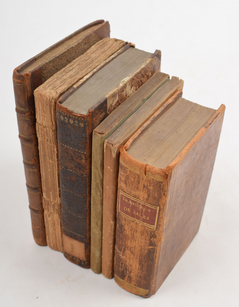 N. Swart, Spreuken van Salomo voor de jeugd. Delft, Bruins, [1828], small 8vo, half leather, 2 parts in 1 volume, engraved title, pasted and signed certificate, dd. 1839, ex bibliotheca Schoolmuseum. - fair; H. Franciscus de Sales, Onderwys of Aenleydinge tot een Godvrugtig leven (....). Mechelen, 1807, small 8vo, full leather, frontispiece. - fair. - and 4 more.