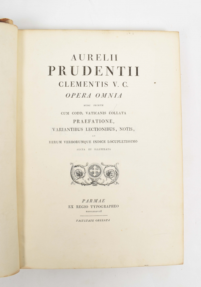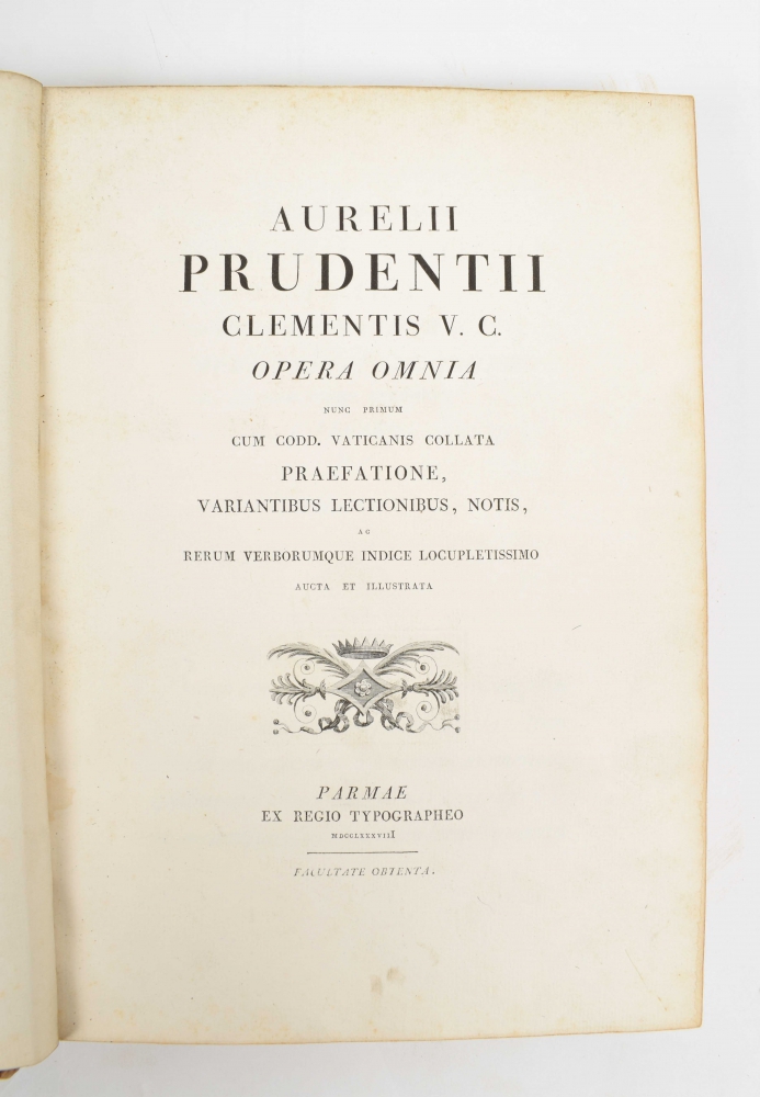 (2) Aurelii Prudentii Clementis V.C. Opera Omnia (...). Parma, Ex Regio Typographeo (Bodoni), 1788, 2 volumes, (10),361; (4),284,(1) p., contemporary uniform sheepskin with gilt device of the Royal Institution on the spines, all edges gilt, large 4to. Both volumes with discard stamp of the Royal Institution at the end. Boards loose, leather worn and dried out. Blook blocks good and with lovely wide margins. (total 2 titles in 3 volumes)