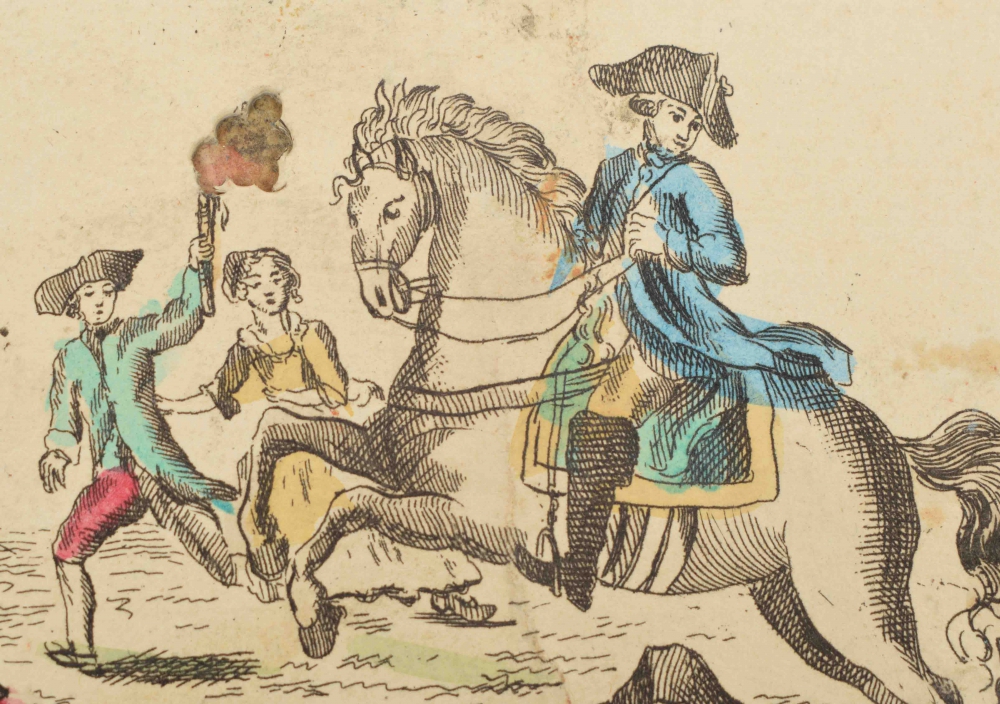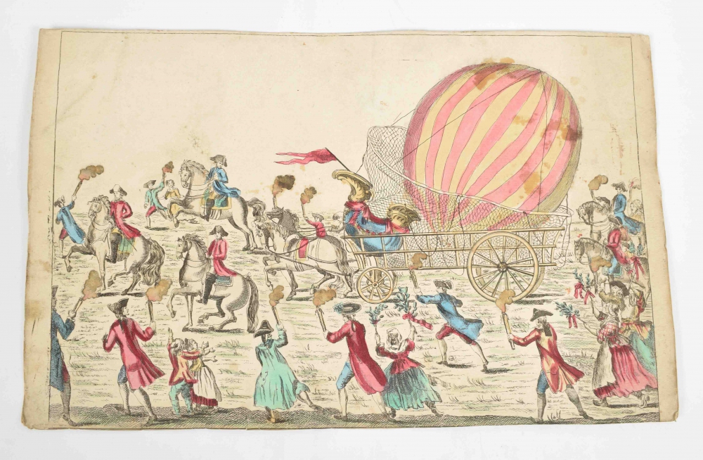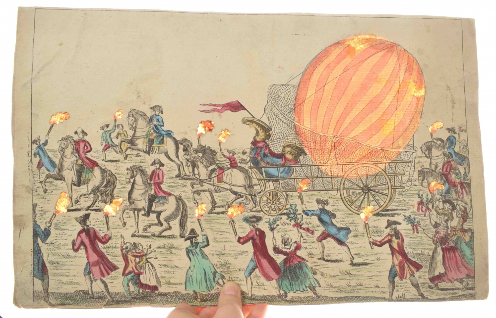 Transport air balloon, France, c. 1785. 45.5 x 28.5 cm. Handcoloured. With openworked torches for light effect. Head and foot margins cut away. Some staining, else good.
