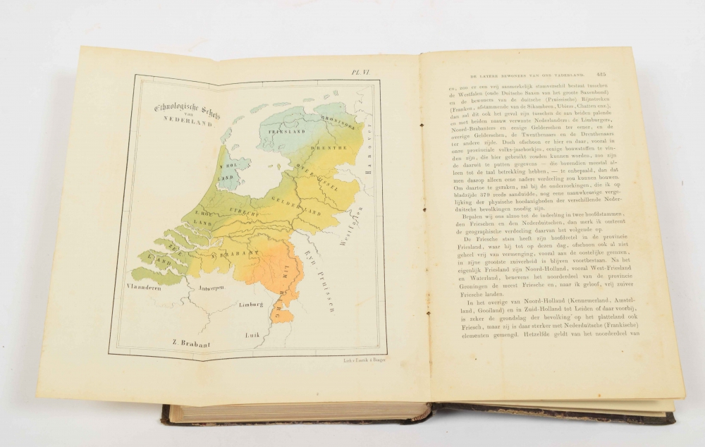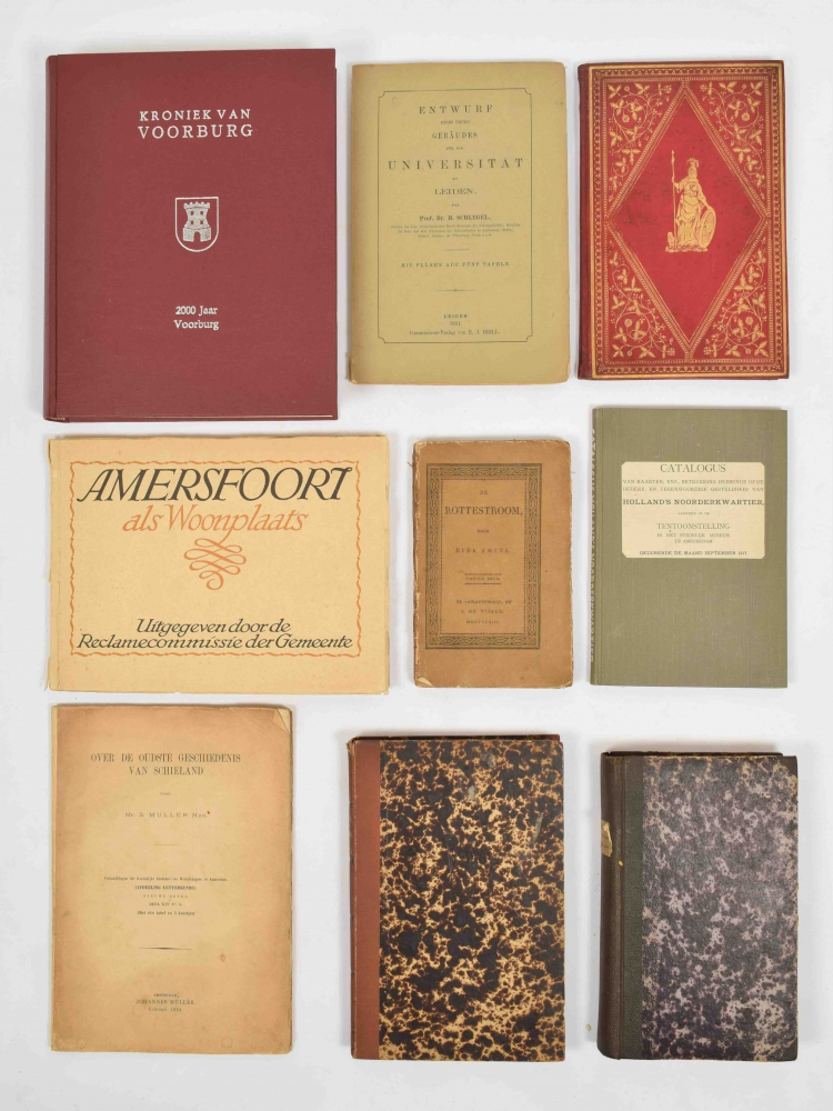 (2) De Rottestroom, door Dirk Smits. Tweede druk. The Hague, S. de Visser, 1823, 167 p., original printed cardboard (cardboard with traces of use). (3) De Haarlemmerhout van 1883-1896. Door Leonard A. Springer. Tuinarchitect. Haarlem, de Erven Loosjes, 1896, (4),56 p., with frontispiece and illustrations, rebound in reused profusely gilt morocco, 4to. (4) Natuurlijke historie van Nederland. De bewoners van Nederland. Door Dr. D. Lubach. Haarlem, A.C. Kruseman, 1863, XII,457,(1) p., with 6 (colour)lithographic plates (incl. 2 folding maps), illustrations in the text, contemporary halfcloth (library stamps). And with 6 more. (total 9)
