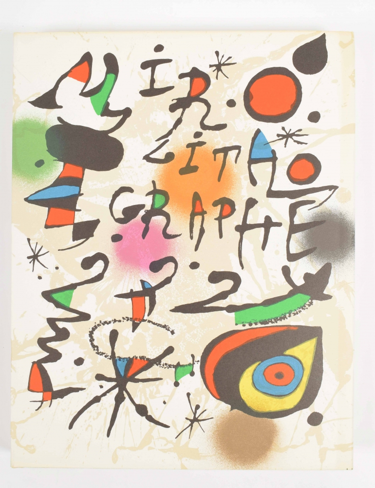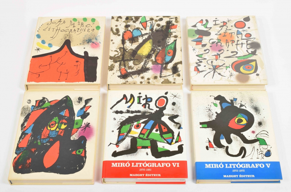 Michel Leiris et al. Vol. I-IV: Barcelona, Ediciones Poligrafa, 1972-1981; V-VI: Paris, Maeght, 1992. Spanish edition. Complete set in 6 vols. large 4to. Complete with altogether 32 original colour lithographs by Miró, respectively 11, 11, 5 and 5 lithographs. Each vol. with original lithographic dust jacket by Miró.