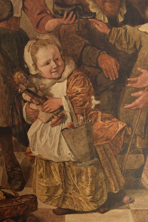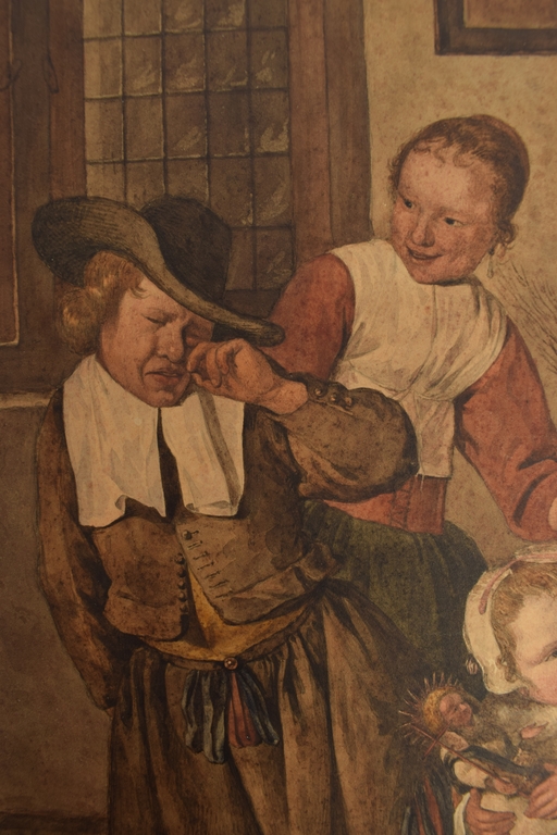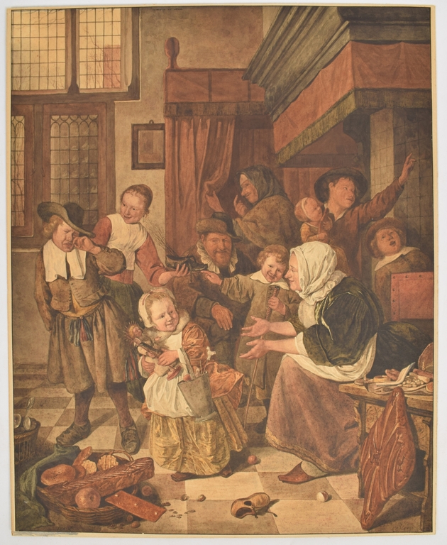 Gouache/ watercolour after the painting by Jan Steen, 40.5 x 33 cm., monogrammed bottom left and signature of Jan Steen reproduced bottom right.